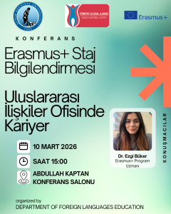 10 Mart 2026 tarihinde saat 15.00’te, bölümümüz öğrencilerinin geleceğine ışık tutan önemli bir etkinlik gerçekleştirildi. Dr. Ezgi Büker, Erasmus+ Staj Hareketliliği ve Uluslararası İlişkiler Ofislerinde kariyer imkanlarını kapsayan kapsamlı bir bilgilendirme toplantısı ve söyleşi sundu.